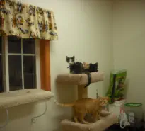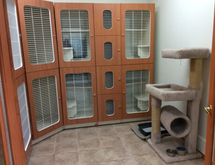 Cats stay in kitty condos in a separate room of the kennel. The condos are glass in the back and next to windows so that they can keep an eye on the bird feeders outside.They are separate units or a door can be opened up so that multiple cats can share adjacent condos. A window perch lets kitties keep track of the outside world or just relax.